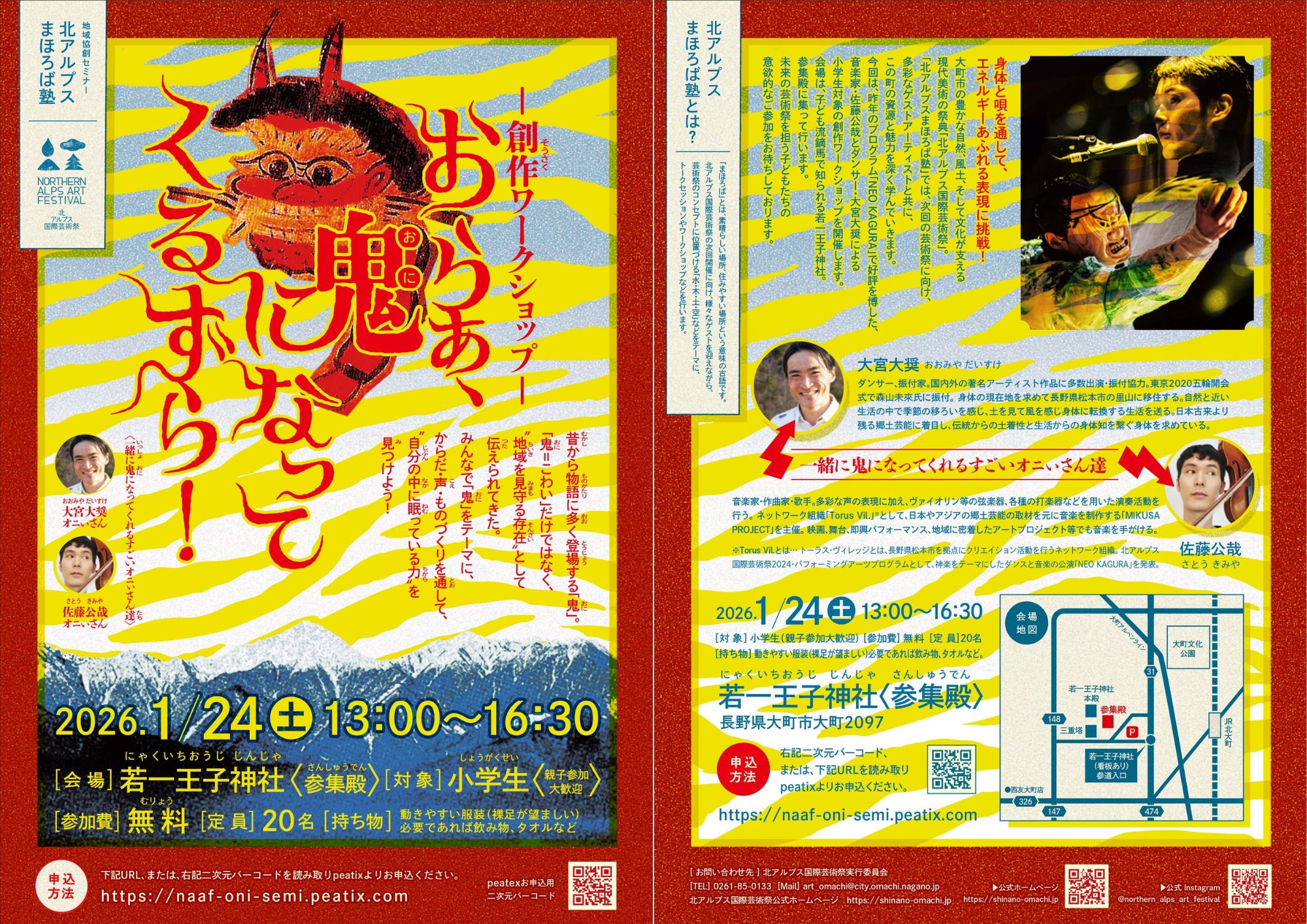 「北アルプス国際芸術祭2024」のプログラム「NEO KAGURA」で好評を博した、大宮大奨(ダンサー/振付家)・佐藤公哉(音楽家/作曲家)のお二人と一緒に、からだ・声・ものづくりを通して〝鬼〟になりきる表現に挑戦してみませんか?